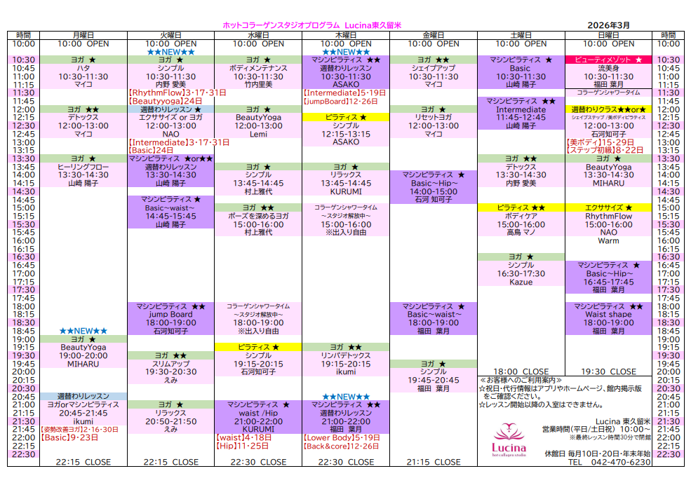 | 3月8日(日)18:00~19:00 | マシンピラティスWaist shape(中級) ⇒マシンピラティスIntermediate(中級) |