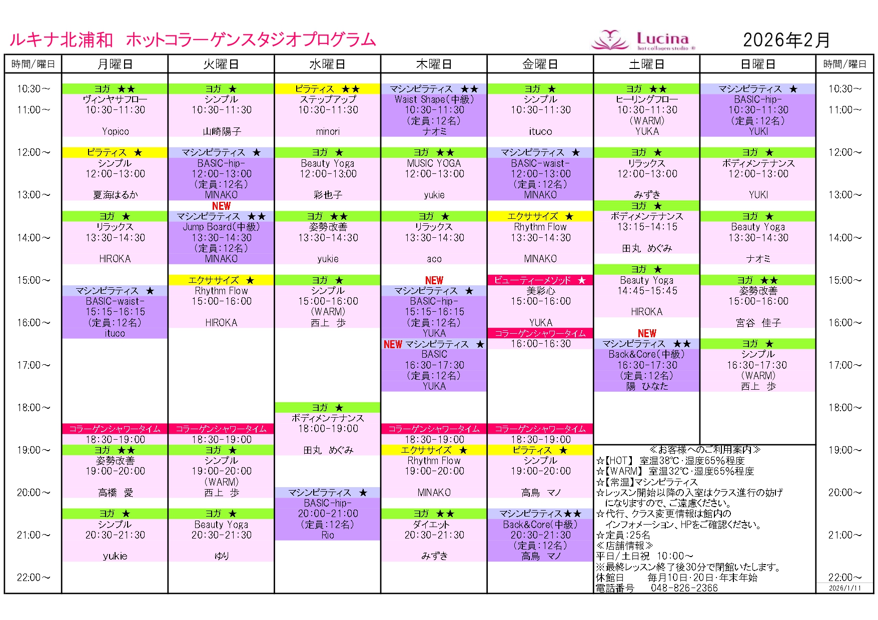 | 2/2(月)12:00~ | コラーゲンピラティス シンプル →コラーゲンヨガ シンプル |