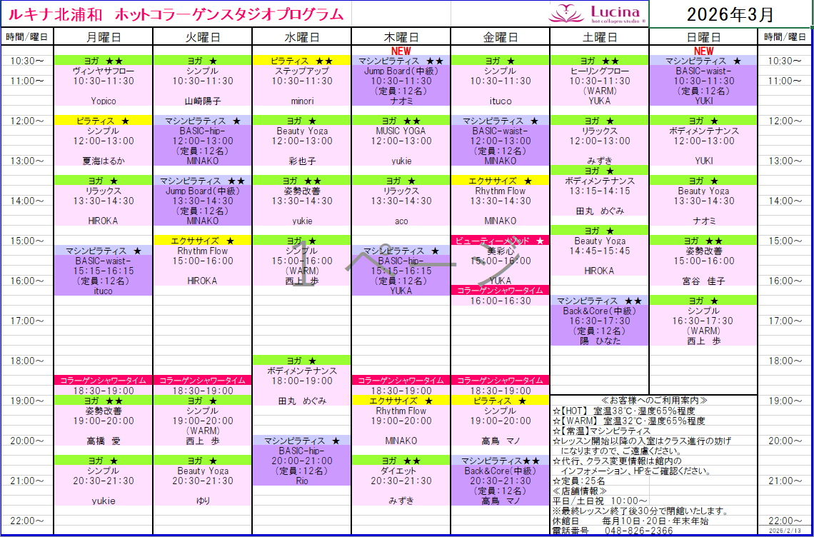 | 2/22(日)12:00~ | コラーゲンヨガ ボデイメンテナンス →コラーゲンヨガ リラックス |