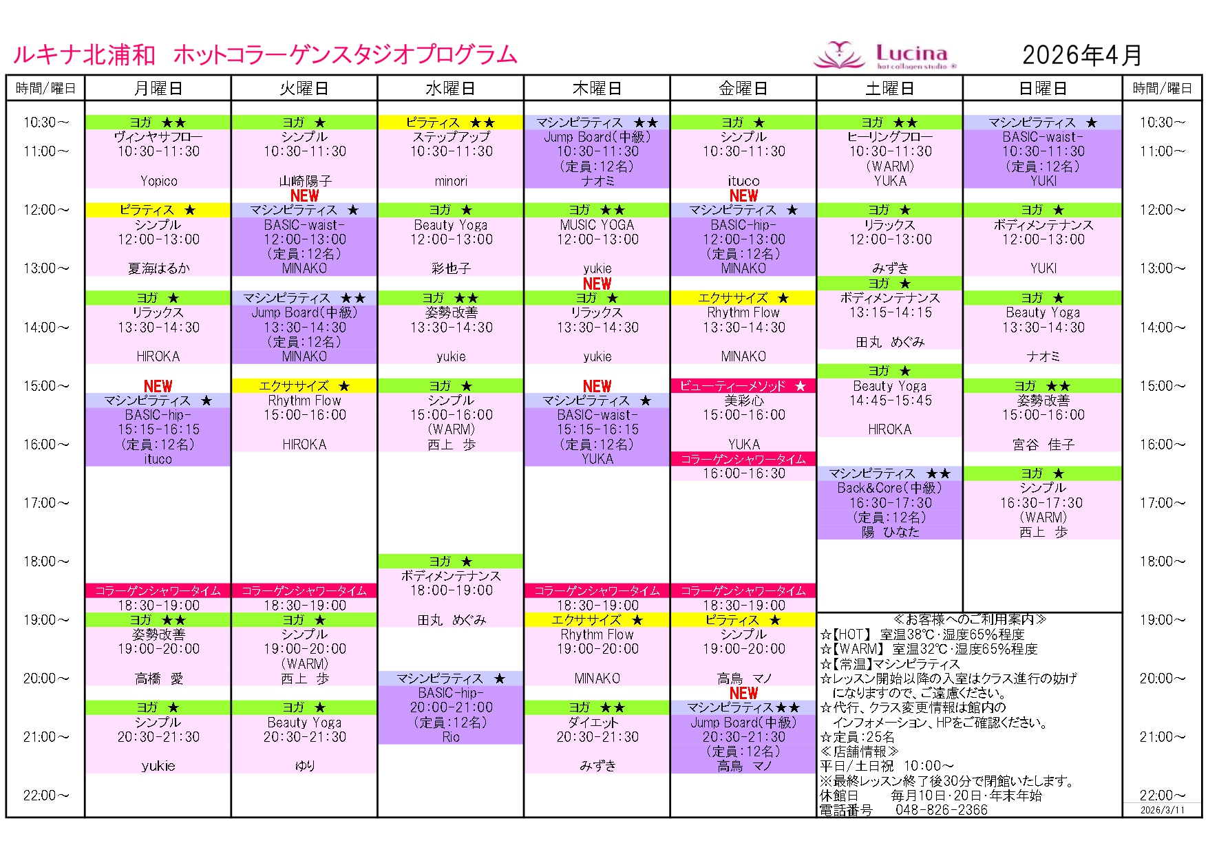 | 5/6(水・祝)15:00~ | GW特別レッスン コラーゲンヨガ ※レッスン内容調整中 |