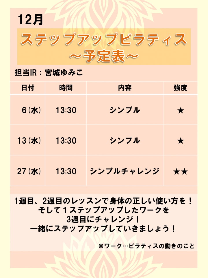 | 12月13日(土)16:30~17:30 | シンプルピラティス★⇒シンプルヨガ★ | 宮城ゆみこ⇒山崎陽子 |